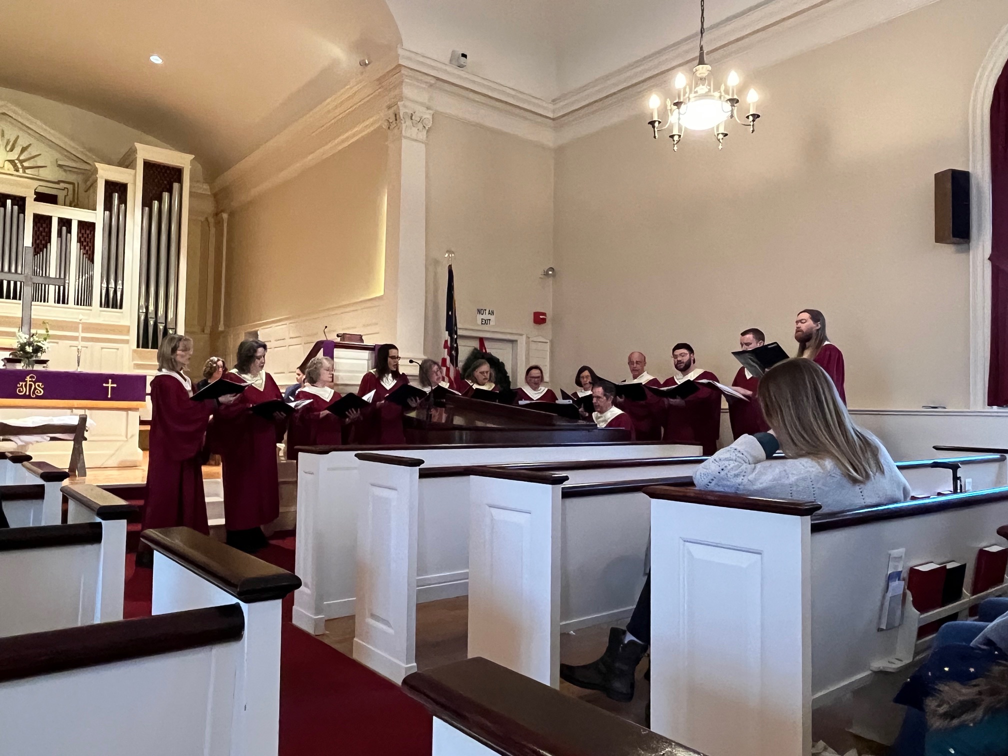 The sanctuary has a fine 2-manual, 18-stop Wissinger tracker pipe organ built in 1987. Opus #7, this organ was Darron Wissinger’s first 2-manual instrument (click here to learn more) and was completed at his Portsmouth, New Hampshire shop. In addition to the pipe organ, we have a Yamaha grand piano in the sanctuary and both are used in services as well as concerts and recitals.